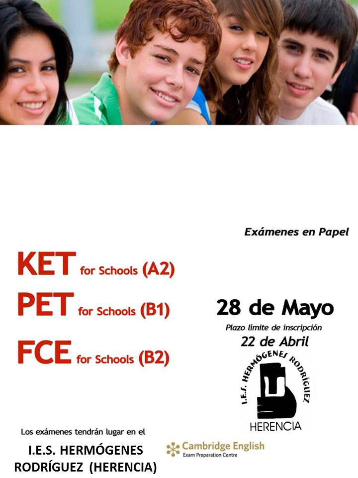 Los exámenes oficiales se celebrarán el día 28 de Mayo en las mismas instalaciones del IES. El plazo límite de inscripción es el 22 de Abril. Los impresos deberán recogerse en la Conserjería del IES y entregarse en Secretaría junto con fotocopia del DNI del candidato en vigor y fotocopia del justificante de pago de las tasas de examen.